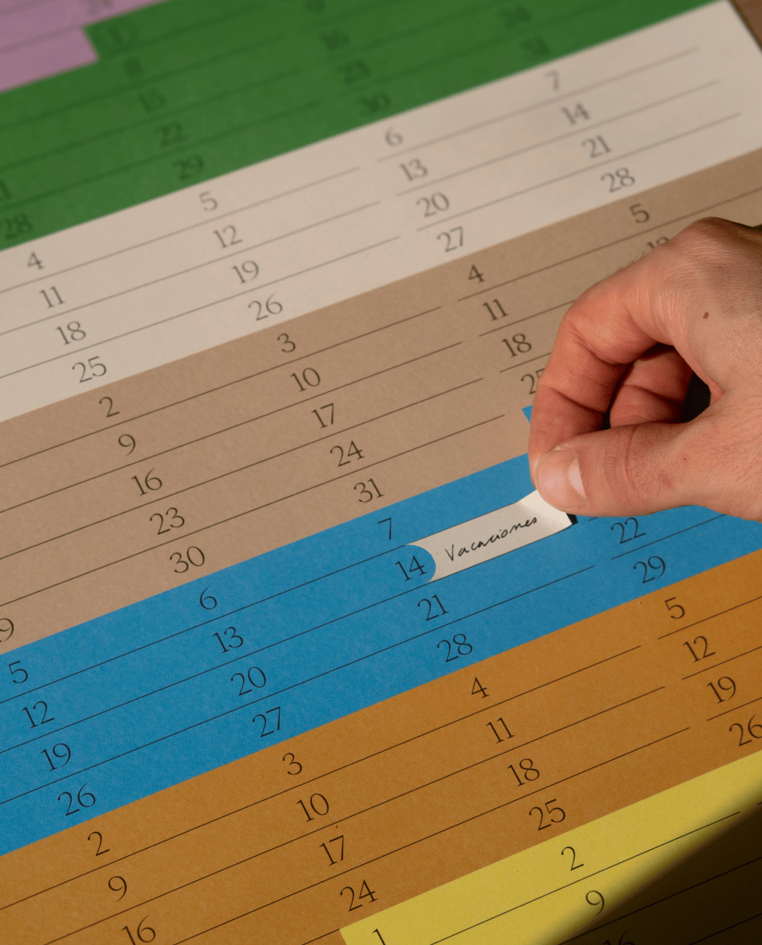 El calendario está organizado por semanas y cuenta con set de 4 hojas de adhesivos reciclados —más de 90 pegatinas rectangulares y circulares— para escribir sobre ellas y planificar tu año. Es ideal para ver el año de forma global y anotar eventos, vacaciones, cumpleaños, fechas de entrega...